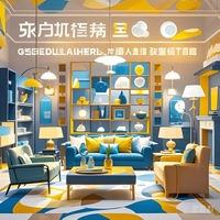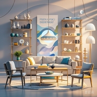 第四幅图片中,客厅的色调较为鲜艳,主要以蓝色、黄色和白色为主。房间中央有一张蓝色的茶几,上面摆放着装饰品和书籍。茶几周围是几张带有黄色和蓝色靠垫的沙发。背景墙上有几何形状的装饰,色彩鲜艳。天花板上悬挂着几个现代风格的吊灯,增加了房间的艺术氛围。两侧的书架上摆放着各种装饰品和书籍,书架的设计独特,带有几何形状的元素。