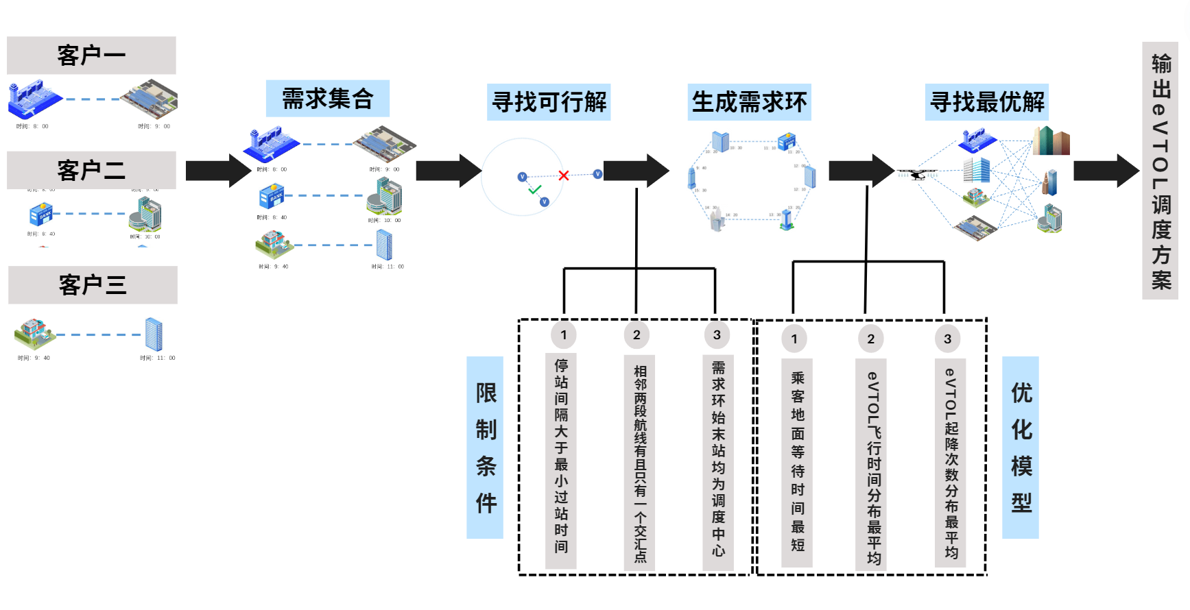 随着科技的不断发展,交通运输领域正在经历一场革命。电动垂直起降飞行器(eVTOL)作为其中的佼佼者,以其零排放、低噪音、高效率等优点,成为了城市空中交通的重要选择。然而,由于eVTOL的技术性能和运营环境的特点,如 eVTOL的起降特点,乘客目的地的多样性,乘客乘坐时间的差异性以及乘客对于 最晚到达时间的要求,乘客出发地的多样性,续驶里程、充电时长约束、随机路 网环境等,为eVTOL调度带来新的挑战。此外,由于目前空中交通工具尚未普及, 因此关于城市空中交通工具调度的相关研究相对较少,因此,本项目针对空中交 通工具的调度问题进行优化设计,以eVTOL作为城市空中交通载体进行研究,考 虑eVTOL对于最大飞行时间的限制,在多站点之间的调度协调性,在满足乘客最 晚到达时间的要求,保证乘客有充足的时间进行乘坐以及eVTOL在起降时有充足 的时间疏散人群的前提下以减少乘客的等待时间与乘坐时间,提高eVTOL的飞行 时间从而提高eVTOL运营公司空中交通的运行效率,降低eVTOL的无用能耗,提高 公司效率。