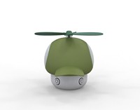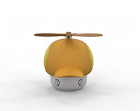 这是一款充满创意和童趣的玩具。玩具的整体造型十分可爱,它的头部由两部分组成:上半部分是一个圆润的黄色球体,球体上有着流畅的线条纹理,顶部还装有一对螺旋桨,给人一种可以飞翔的感觉同时还可以在炎热的夏天为小朋友提供凉快的风;下半部分是白色的,有两个圆形的黑色眼睛图案,看上去非常呆萌。在黄色球体和白色头部之间有一个黄色的帽檐状结构,像是给玩具戴上了一顶俏皮的帽子。这个玩具的设计简单,色彩搭配鲜明,不仅可以作为孩子们的夏天室外玩耍时随时随地的小风扇,还能成为家居装饰的有趣点缀,充满了实用性、趣味性和观赏性。