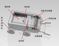 乒乓球自动捡拾机整体呈矩形,底部安装有四个麦克纳姆轮单驱,方便移动。前方是捡拾装置,由多个滚轮组成,滚轮表面有特殊的橡胶纹理,可增加与乒乓球的摩擦力。捡拾装置后方是倾斜的收集通道,通道连接到存储箱。存储箱位于机器中部上方,可容纳较多乒乓球。机器顶部设有操作面板和显示屏,用于控制和显示工作状态。