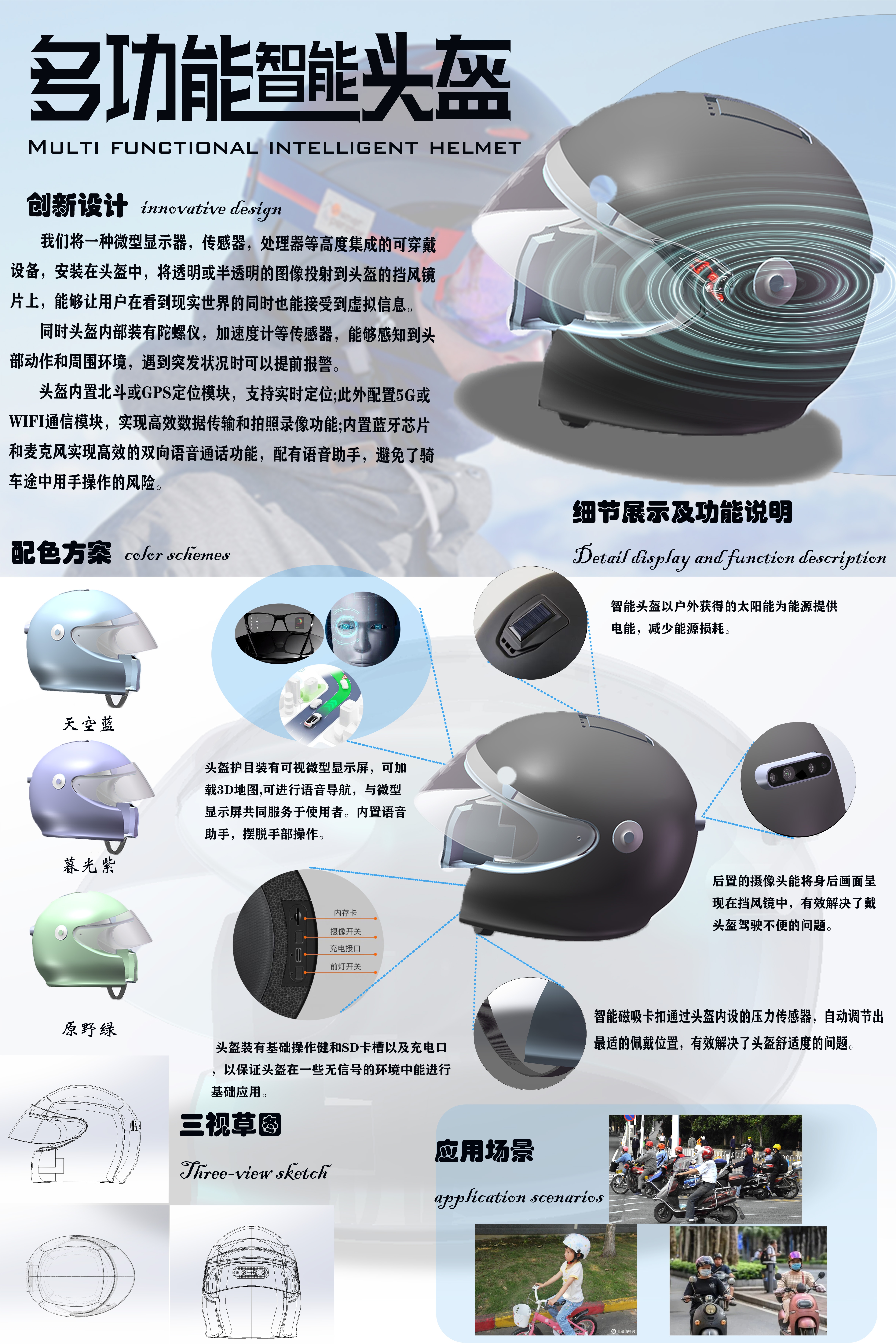 为解决电动车驾驶人不带头盔的社会问题,我们团队从舒适、美观、实用性等多角度考虑,用智能化、自动化的方式解决这一问题。首先,采用内置压力传感器结合磁吸卡扣实现自动化穿戴调节,以多档位的调节方式来提高头盔舒适度、穿戴简单化,让大众爱上戴头盔。其次,我们以太阳能协调充电的方式降低能耗,以后置摄像头、身后可视化的智能挡风镜来提高驾驶的安全性。同时,头盔内部安装定位模块和加速度计传感器,可以通过智能语音助手将目的地的地图显示到智能挡风镜上,真正意义上的解放双手,降低驾驶分心带来的危险;如果遇到速度骤降,磁吸卡扣会紧密贴合头部,最大程度上保证驾驶人安全。