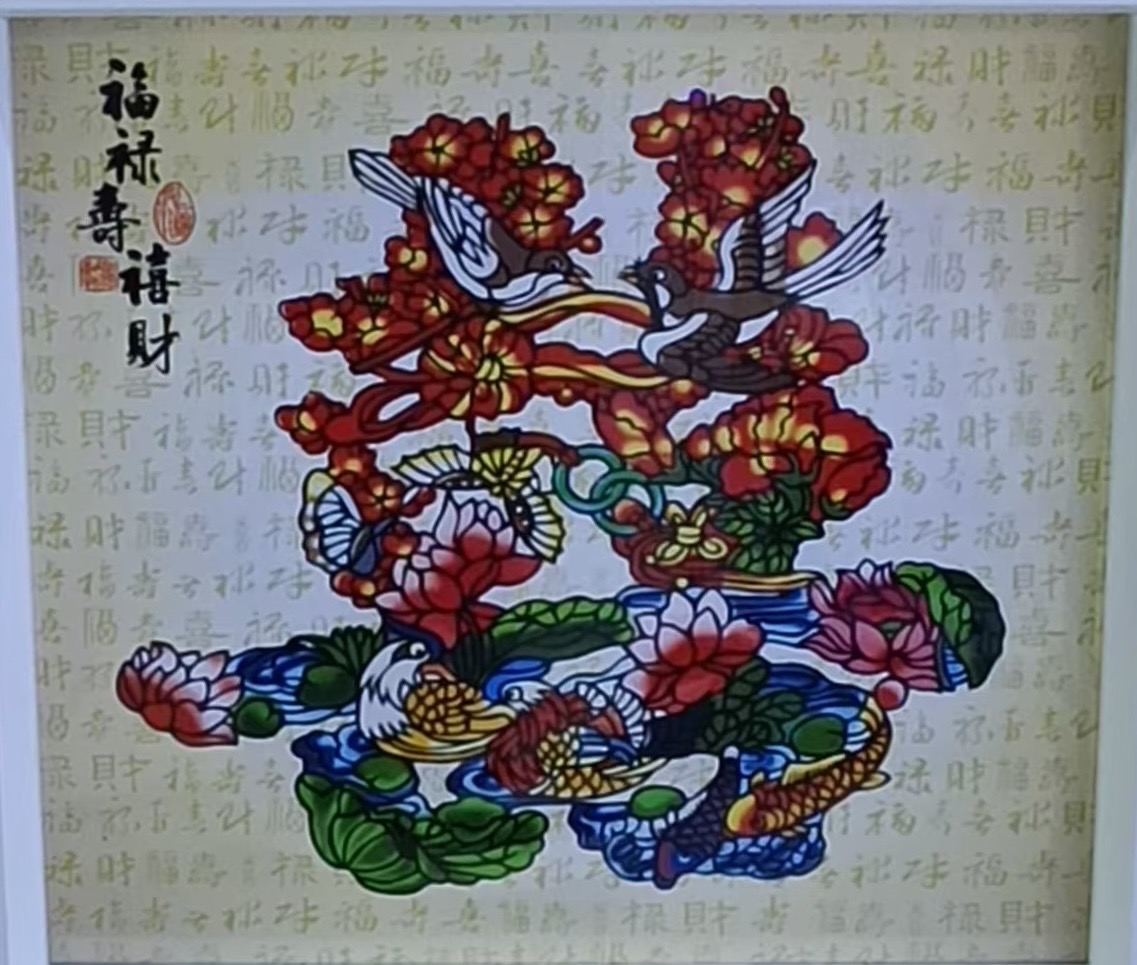 这幅作品是蔚县非遗剪纸,属于中国国家级非物质文化遗产,也是中国唯一以“阴阳混刻+重彩点染”为核心工艺的民间剪纸品类。其特点可从以下维度解析: