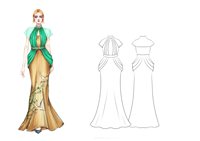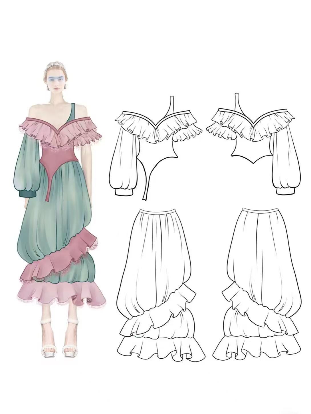 本设计聚焦职场人员正式商务场合及商务晚宴的着装需求,以 “高贵优雅的中西文化融合” 为核心设计理念。灵感源于中国传统服饰的典雅基因与西方礼服的精致剪裁艺术的碰撞,旨在打造兼具职场商务正式感与晚宴优雅魅力的女装作品。