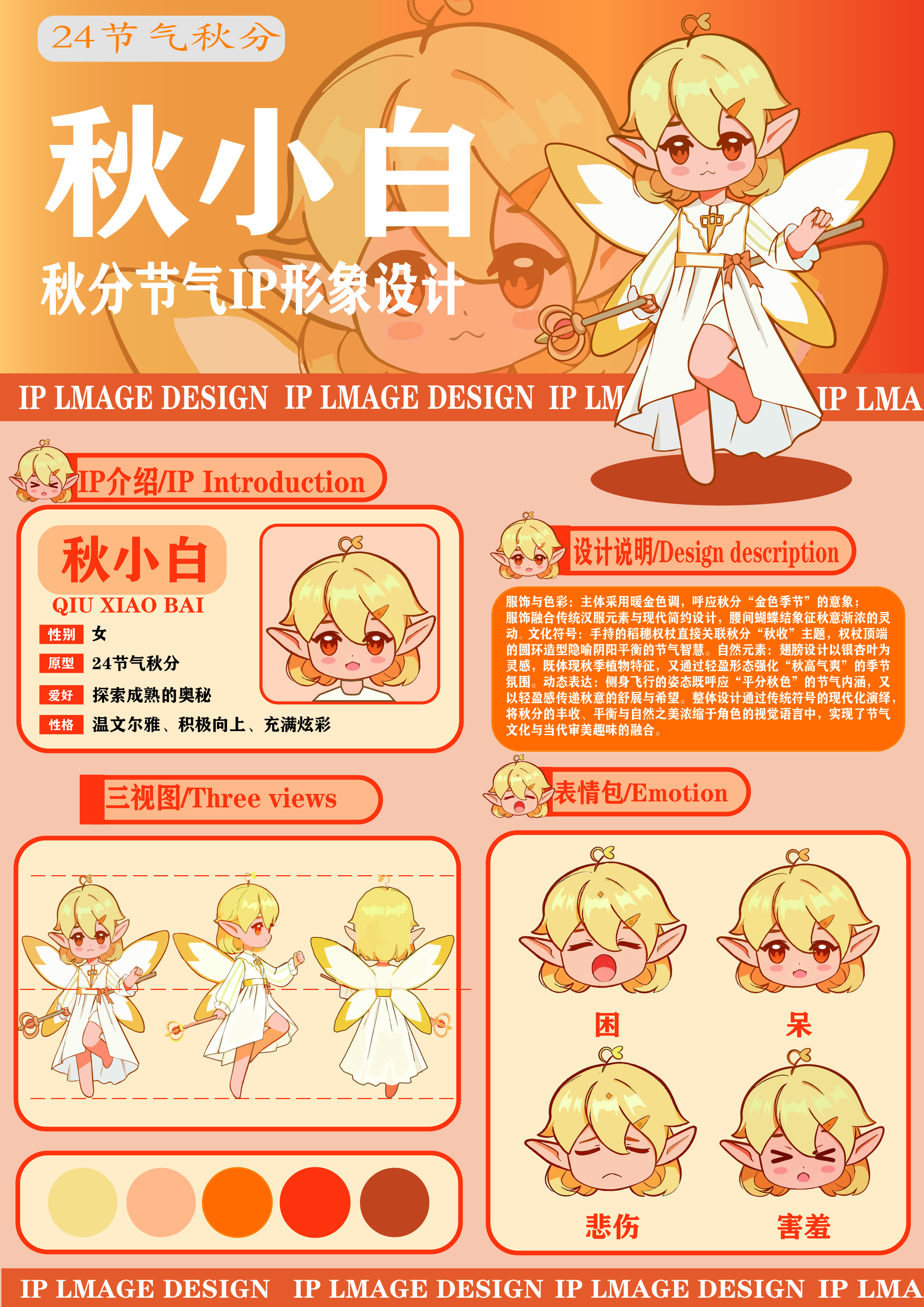 本作品围绕24节气中的“秋分”,打造了IP形象“秋小白”。她以秋分节气为原型,是一位有着金色头发、精灵耳、手持稻穗权杖的温雅精灵,整体采用暖金色调呼应“金色季节”的秋分意象,服饰融合传统元素与现代简约风格,腰间蝴蝶结象征秋意渐浓的灵动。