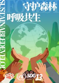 第三张海报采用绿色系,地球被多双手和动物的爪印共同守护,配以“守护森林,呼吸共生”的标语,对应SDG 13(气候行动),体现人与自然和谐共生的重要性。