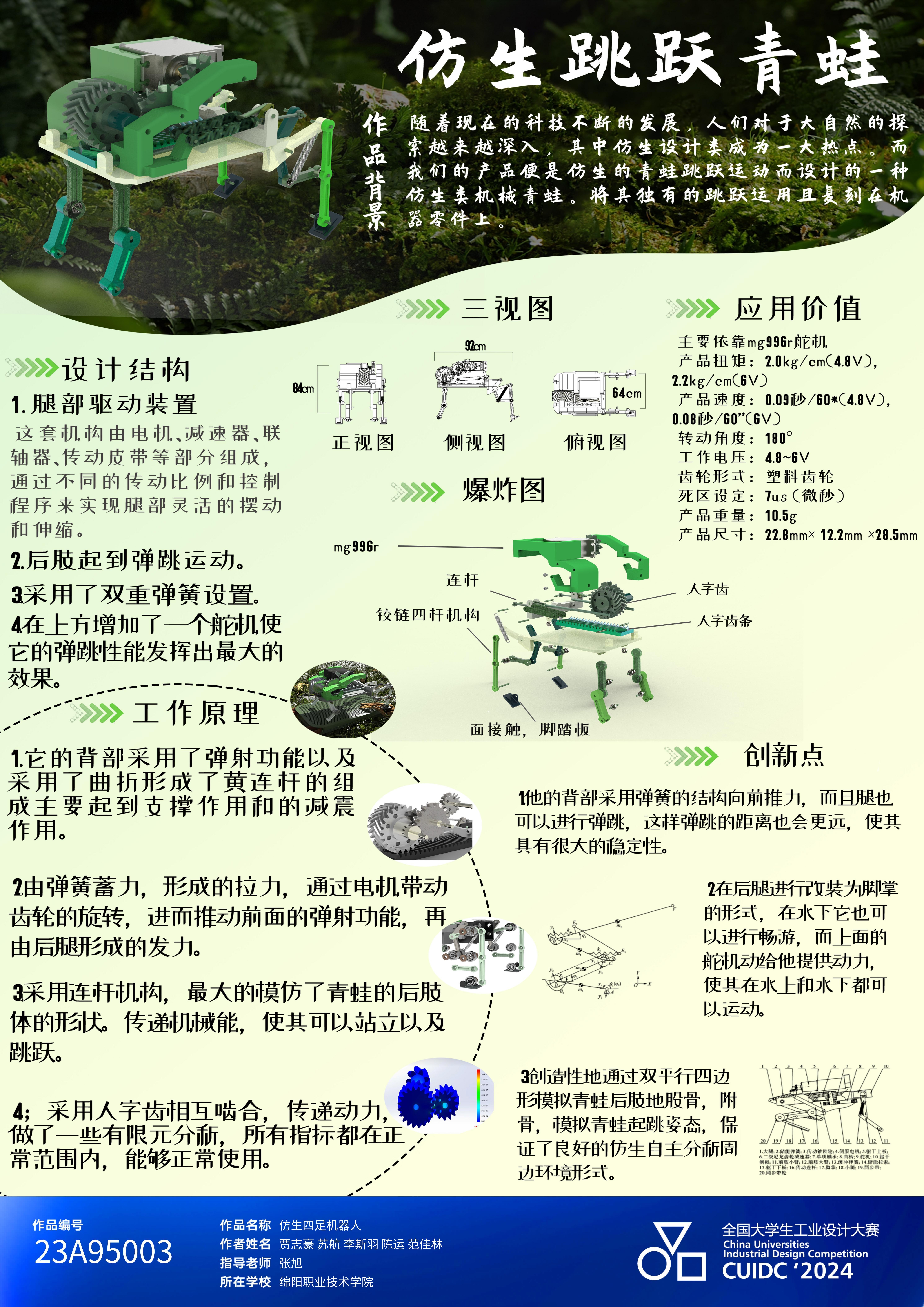 此产品为仿生青蛙机器人,具有噪音低、运动灵活、环境适应能力强、低能耗等特点。目前,本产品在噪音控制、运动灵活性、等取得了较好成绩,能够适应多种表面,通过背上舵机的带动齿轮运动,整体控制元件共三个人字齿,两两组合,嵌在发条上能够储存力,前轮模仿飞机起落架,设置了缓震轮,青蛙通过手机蓝牙连接控制其运动,我们创造性地通过双平行四边形模拟青蛙后肢地股骨,附骨,模拟青蛙起跳姿态,保证了良好的仿生自主分析周边环境形式我们创造性地通过双平行四边形模拟青蛙后肢地股骨,附骨,模拟青蛙起跳姿态,保证了良好的仿生自主分析周边环境形式,第一时间发送有利信息通过头顶天线发送到指挥中心,操作员进行决策并实施行动。