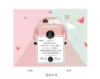 内页: 为了协调统一,在色系上完全匹配封面。内页中央一男女主角乘坐敞篷婚车,女主头披头纱随风飘扬,女主高兴地手拿捧花,像是告诉全世界:“我结婚啦!”。婚车开向他们的幸福殿堂。车后悬挂提供给宾客的信息,运用“黑”、“白”色,表现正式,高贵感。添加带翅膀的心为背景,烘托他们现在对结婚心情激动,飞扬。