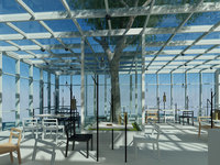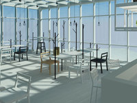 采用洁白色桌椅,没有过其他的颜色,使人沉静放松,在喧闹的城市紧张的神经得到片刻休息是多么惬意的事情。咖啡厅中间放置天然绿植大树,用通透的玻璃隔断,让人更好地直观感受绿色,感受自然。除此之外,可以说另个有特色的设计是桌边黑色的树枝造型的物体,放眼望去像一些不规则树枝,用作这么安静的洁白的环境中装饰并不跳跃,而且同时不能忽略它的功能性,可以当作衣架,挂物品袋的用途。简约而不简单。