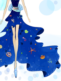 款式上,婚纱裙身整体剪裁属于独特的前短后长型大拖尾,新娘可以身着长款婚纱优雅高贵地走上红毯的同时,也可以展现出腿部纤细的线条,托尾的裙摆设计成如海洋的纹路,自然流动,整体海蓝色的自然过渡从上至下慢慢由深变浅。值得一提的是全身海洋生物的立体印花设计,头纱上的贝壳配饰与新娘胸前的贝壳设计依据贝壳表面独特的质感,配上珍珠,仿佛从海里上岸的美人鱼,套脖式的着装也是今年流行的一种热潮,因此我将这一元素加入海星的配饰运用到新娘优雅的脖颈处,比起项链而言更加独特活泼