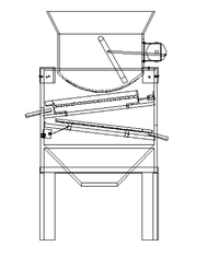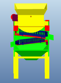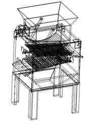 本设计是一种高效率、节省空间、具有双重筛选栅格板组成花生脱壳机。其中粉碎部分包括外侧电机、转子、连接盘、连接板、销钉、和刮板,电机由螺丝钉进行固定。刮板与上半部分由轴承连接,连接杆左边与电机的连接盘进行连接,右边与刮板进行连接。筛选部分由四块铁板组成,并由立体的方形卡槽在螺丝钉的作用下进行固定,第一层栅格板由两根圆柱通过螺丝在铁板上进行固定,栅格板在电机的作用下通过连接杆进行运动,并带动栅格板的来回滑动,栅格板由众多的圆孔组成,并在栅格板的尾端设置出料口,第二层栅格板跟第一层栅格板类似,第二层孔的半径比第一层小,第二层栅格板在电机的带动下进行来回滑动,并设置出料口。出料口与第一层栅格板出料口相反,防止花生仁与壳之间的混乱。而且底部也设置出料口,进行花生壳碎渣的掉落。最下面由一个底座构成。在将花生放进进料口时,花生在刮板的撞击与挤压进行剥壳,粉碎的花生壳和完整的花生仁从碾碎板掉落,然后经过位于碾碎板下部的第一层栅格板,栅格设计成圆孔的板子,圆孔的半径比一般花生人的直径稍微大一些,在花生仁掉落的同时经过第一层栅格的筛选,花生仁掉落,花生壳经过倾斜栅格的来回振动将花生壳运输到外面。在花生仁掉落的同时经过第二层栅格,第二层栅格设计成为直径比花生仁的直径小得多,此层栅格的设计主要筛选掉花生壳的碎渣,花生碎渣将经过栅格板的振动被运输到外界,从而达到分离的效果。