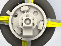 我们的爬楼轮椅,当轮子内部支架不需要变形时,制动器断开、离合器闭合,电机轴上的小齿轮带动与空心轴相连接的大齿轮转动,从而带动整个轮子的转动。当轮子内部支架时,制动器通电、离合器断开,电机带动空心轴相对于实心轴转动,从而完成支架折叠的过程。电磁制动器在使用时其中一部分安装在机架上,另一部分安装在需制动零件上;与机械制动相比,其具有结构紧凑、响应速度快、操作简单、可靠性高等优点。