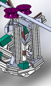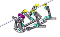 高压线破冰机器人主要由运动执行装置,越障执行装置,破冰执行装置构成,运动执行装置包括悬挂在高压线上的四个驱动轮分别安装在四个手臂上,两个驱动轮在右侧30度斜切在高压线上,另两个驱动轮在左侧30度斜切在高压线上,使系统更加的稳定。越障执行装置的四个电机分别安装在四个手臂的下侧,由丝杠运动进行运动执行装置的开合操作,由连杆机构可以在水平和竖直方向同时产生位移,能够跨越防震锤、悬垂线夹等障碍,由连杆机构控制悬挂轮可以适用多种现况,越障能力强。破冰执行装置采用仿形铣刀进行主破冰,进行全方位除冰操作,该机构易改装,执行部分可以使用各种破冰动作,同时可以运用于高压线的其他操作,可换性强。
