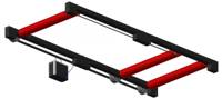 1支架部分:如图所示,主要起支撑作用,与地面保持一定高度,保证自行车轮胎不会着地,支架中部设计为可折合结构,起到便于携带的作用,折合起来也解决过多占用空间的问题。支架上依次打有互相平行的孔,为滚筒安装提供便利,同时具有便携易于快速安装使用的优点,前轮滚筒处设计五个孔主要为调节前轮滚筒位置准备,以适应多种尺寸类型的自行车,产品的使用范围得到很大的提高;支架共设有六个支脚起简单支撑的作用,中间两处支脚主要避免折合处受力过大,损坏结构,进而通过加装两个支脚,提高折合结构可靠度寿命;每个滚筒安装出设有可固定滚筒内圈旋塞,根据实际需求控制旋塞的旋入,为后续便于滚筒发电部分安装调节。