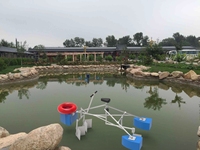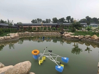 碧波浮舟为一种水上娱乐设施,以划车为主体采用桁架结构,其下端设有三个流线型充气囊,用于支撑划车漂浮于水上。设计了仿生式折叠合页浆完成划水动作:在划水时两桨叶依靠水的反作用力打开(打开角度为160度),在不划水时两桨叶依靠水的反作用力闭合(闭合角度为20度)。辅以电动转向舵控制行进方向。划车在水上可提供划船和骑自行车等一系列运动项目,以及穿绕障碍物和竞速等水上娱乐项目。划车设计为可重组式结构,其杆件及其接头均为标准件,可供多人自主拆卸和组装成不同形态的娱乐及运动设施,在重组过程中可提高亲友们的动手能力及扩展思维能力。