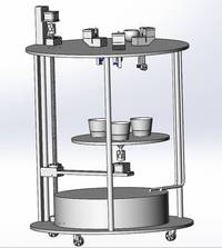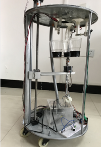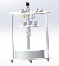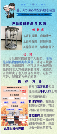 本装置是一种基于Arduino的配药助老装置,包括电动抽水器、储存水的水箱、水杯、丝杠托盘,步进电机等其他辅助功能系统,储药装置包括药盒转盘、药盘盒和步进电机;电动抽水机包括泵壳、水泵、抽水管与出水管组成;其他辅助功能系统包括药盒转盘的转速,药盒转盘转动的时间,步进电机的转速和时间,控制药物下移的速度和位置;电动抽水机安装在整体装置的下部分,Arduino控制水泵的工作,老人服药时流出适当的水,自动配药助老机可实现按每日吃药次数预设多日服药时间,根据设定时间将药品与饮用水送于老人身边并进行提醒,这款发明的闪光点就在于它可以通过转盘旋转的速度和时间旋转到药物的出口处,通过胶囊定向排列装置,保证胶囊下落的顺利进行,进一步确保老人服药的准确性, 丝杠在步进电机的带动下实现上下的移动,这一设置可以方便老人对药物拿取,整体的框架采用圆柱形的设计,这样具有稳定性高,方便快捷,可控性好的特点。