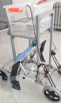用铝合金型材搭配整体框架(常见的施肥器械框架),并用角件固定型材与型材的连接处,之后由上而下,最上部为盛放肥料的长方体料斗,并在料斗底部安装一个排肥盒,排肥盒的右边连接一个电机,通过电机转动,驱动盒内的齿轮转动,实现均匀化、合理化落料,减少了肥料的损耗,在车子的两边分别装有一个带犁头的扎土装置,并在料斗下方安装了可实现上下及左右移动的光杆机构,由光杆机构带动左右扎土装置进行上下及左右运动,从而实现了在不同工作环境下自动调节及扎土破土的功能,并在犁头上方装有红外线传感器,可以实现精准定位,精准打孔。后再由塑料软管作为通道将肥料由排肥盒通到梨头内,再由光杆升降机构将扎土装置扎入土壤内,实现肥料的下落以及犁头的提升,最后由齿轮带动轮子进行前行和转弯,真正做到全自动工作。