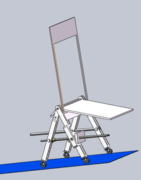 当老人独自在家活动过程中,可以推着本装置辅助行走,如发生意外跌倒后,老人可躺在该装置靠背上,按下上升开关,脚座中间的螺纹旋动,从而使两只脚座进行收缩,这样就可以达到让老人慢慢趋近于可以站立的高度,最后达到老人站立的目的。该作品除了辅助行走、辅助起立外,另配有智能报警系统,如果老人跌倒后无法自行操作本装置使其工作,老人就可以自行按下报警开关,家人就会第一时间接收到信息,进而确保老人独自在家的安全性。