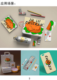 本次设计根据巨鹿县特色农产品——枸杞、金银花和烧鸡来创作,图一展现的是一只鸡在盘子上追着枸杞小人和金银花小人,在它们的上面有一个在奸笑的小人投影,结合了“螳螂捕蝉,黄雀在后”的故事。连接到图二,烧鸡为主体,枸杞小人和金银花小人晕倒在烧鸡周围,成为一道美食。两幅插画可以放在包装盒、手机壳等。