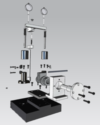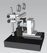 测量仪以基座作为基础元件,其上放置被测工件的定位装置、测量装置。这些装置由圆柱头六角螺钉紧固在基座上。定位装置由调整环、心轴、支架、垫铁构成,测量装置由左右两套支撑小心轴的支架、支撑百分表的表架和校表块等零件组成。其中调整螺母,调整杆以及调整座组装后形成差动机构。