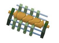 本次设计的意愿是想通过单一输入,完成多个爪具之间的抓取以及变距两个过程。整个流程分为爪具夹紧、爪具与爪具之间变距、爪具放松、爪具回到初始状态四个过程。具体流程如下:首先是圆柱凸轮的旋转输入,此时与圆柱凸轮联动的盘装凸轮旋转到近毂,两个爪体之间的弹簧提供夹紧力进行夹紧操作,然后旋转到一定角度,待爪具完全夹紧之后,圆柱凸轮运动到相应角度进行变距操作,变距完成后盘状凸轮推动推杆放松爪具放下工件,最后圆柱凸轮推动爪具回到初始状态。整个过程使用单一的旋转输入,完成变距和加紧放松两个输出,相比于使用气动原件进行加紧与放松,本设计更加节约了气缸的使用,局限性更少,适用性更广。