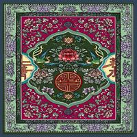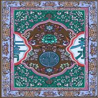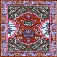 这幅作品主要运用了牡丹纹,加上寿字纹,卷草纹和仙鹤等元素的点缀,配合着喜庆丰富的色彩,显得富丽、吉祥、珍贵。