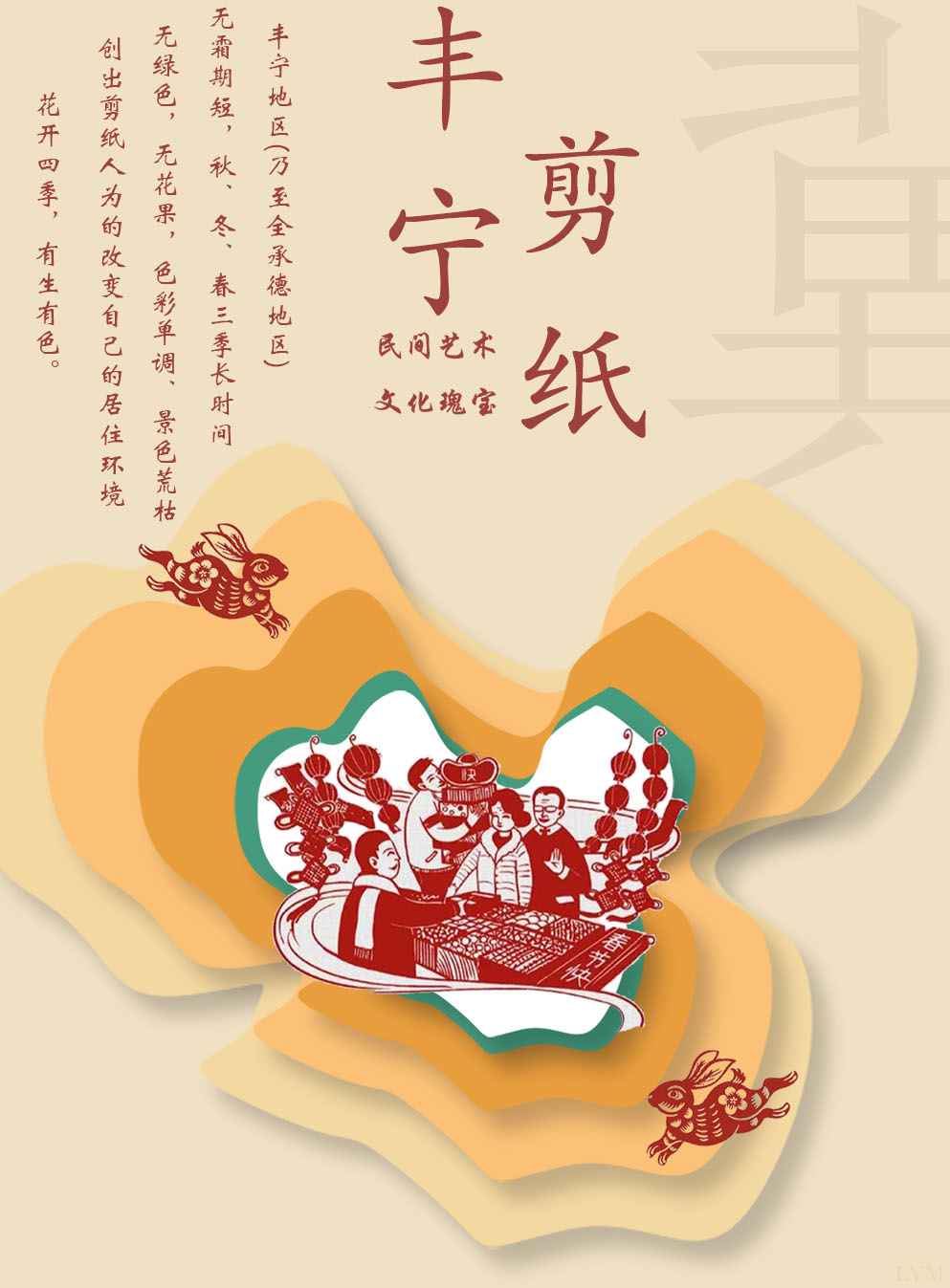 河北省丰宁满族自治县地处塞北,民间流传的丰宁满族剪纸始于清代康熙年间,至乾隆年间形成了具有地域特征与民族特色的新异风格,它以阳刻为主,阴刻为辅,批毛纤长,剪工精细。清末民初丰宁满族剪纸进入鼎盛时期,1949年后在形式和内容上又有了进一步的发展,更为贴近现实生产与生活。1960年以后,剪纸艺术创作堕入低谷。1982年,丰宁民间剪纸队伍重新建立,其作品随着各种展览和出国表演在海内外造成广泛的影响。1993年,丰宁被文化部命名为“中国民间剪纸艺术之乡”。