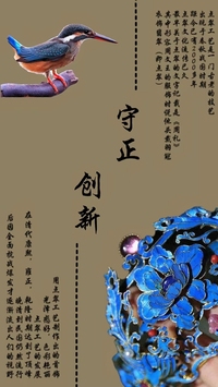 “关于点翠”创意来源于我国非物质文化遗产“肖式点翠”,运用插图和配字的方式制作图片,色彩主要运用蓝色,米白,棕色,色彩鲜明对比强烈,可以让读者在感受到点翠的独特美丽时,通过文字对点翠文化进行了解,字体主要运用行楷,与图片整体融合。