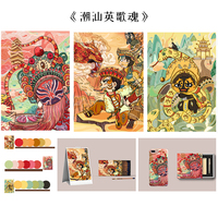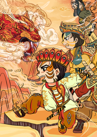 第2幅作品以武松为代表,人物以英歌舞的服饰特色,以及表演人物的特色和各元素进行创作,整体颜色以黄色为主, 说到武松最为代表的就是武松打虎,画面中最为代表的武松还有作为其他的英雄好汉一起向前冲的画面,整体表现故事性强,以此来展现梁山英雄的侠义风采。