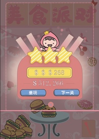 创建了一组关于美食的游戏UI设计。主角人物有许多人物造型,主体美食有汉堡,甜甜圈,蛋糕等以供选择。游戏主页包含游戏模式、游戏入口、排行榜、道具间、金币、商店、设置的按钮让玩家一目了然