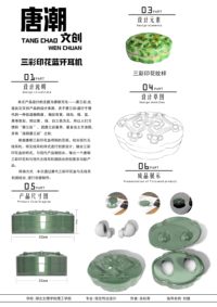 三彩印花蓝牙耳机借鉴了唐三彩,也是此次文创产品的设计来源。关于唐三彩:盛行于唐代的一种低温釉陶器,釉彩有黄、绿白、褐、蓝、黑等色彩,而以黄、绿、白三色为主,所以人们习惯称“唐三彩”。因唐三彩最早、最多出土于洛阳,亦有“洛阳唐三彩”之称.根据唐朝三彩印花盒得到的灵感,结合现代无线耳机。将无线耳机样式进行创意设计,融合三彩印花盒的样式,与现代产品相结合。做出一个唐朝三彩印花和与现代无线耳机相结合的创意多功能产品。转换方式:本次通过唐代三彩印花盒与无线耳机相结合,进行创意制作。