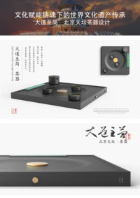 这套茶具灵感来源于世界文化遗产中的北京天坛,将坛墙南方北圆与茶盘造型融合,象征天圆地方。将中国素有“以黄为贵”的传统与茶盘出水口相融,重现古代农业“敬土”思想以及五行中的“中央土”之黄色为主体与正统的品格之方圆。以及茶盘中圆内聚的形态形成自上而下的呈辐射状的政治利制思维,凝聚民众向心力的礼制之方圆。茶盘以古代城规中的死角城墙为灵感,中间靠北以玉体现皇宫的琼楼玉宇。材质上以黑陶与黄铜相配,体现君子品格的内柔外刚,内直外通,方圆兼济。