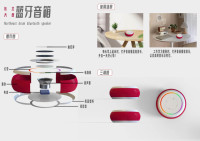 本产品的设计灵感来自于沈阳非物质文化遗产“东北大鼓”中演员自击的书鼓,形状为扁圆形,两面蒙皮,将书鼓的整体外观形态与蓝牙音箱相结合,整体造型圆润,有质感,整体分为三个部分,上面这部分增加灯带装饰,可随着音乐的播放变幻出不同的颜色,增加氛围感,享受感,按键简洁美观,易于识别,中间箱体部分做了全包围发音孔,增强音乐质感,让您尽情享受“好声音”。随着东北大鼓的听众大批转移,传承和演出遇到严重困难,生存出现危机,在此情势下,保护和发展东北大鼓刻不容缓。东北大鼓与蓝牙音箱都与音乐相关,所以将两者结合起来,让人们更多的关注到东北大鼓。