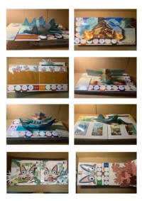 立体书籍可以经过翻折、旋转、开合等一系列的操作,可以跟读者进行有效的互动,不仅具有消遣娱乐的功能,还能增加于阅读的趣味性。但是书籍的需要展开,一般的书籍无法做到,就要重新考虑书籍的装帧形式,所以采用经折装方式,就像新版立体书籍《西游记》的装帧方式一样。由于考虑到书书籍的枯燥性,所以准备将飞行棋与书籍进行结合,两者结合可以将书籍变得更加而有趣,人们在阅读同时,可以邀请他人进行游戏,从而使的更多人知道瓦猫的故事,并能够记住它,将它传递给更多的人,更好的达到选题的目的。首先确定书籍的装帧形式,在此之前,通过书籍装帧课程中学习到了许多的书籍装帧的形式,如龙鳞装、平装、经折装等,经过系列的研究决定从经折装入手,但是一般的经折装只能做到长方形的形状,无法做到正方形的形状,所以在原有的基础上进行形态的改变,进行创新设计,使得书籍可以绕成一个正方形,书籍的页数为16页,正好可以绕成一个完美的正方形,每一张的尺寸为25×25cm,书籍的内容设计主要为四个大部分,分别以瓦猫的四个传说故事为脚本,进行内容的设计。书籍展开图的每个对角则新加11cm×13cm的新择折页,每个折页外面的内容设计为瓦猫的故事,内页则是飞行棋的棋盘和起始点,飞行器的棋盘则是在每一页的下方,尺寸大小为6cm×25cm,并且在飞行棋盘的下面则是有对应的惩罚和奖励,成寸大小为4cm×5cm的小卡片,可以通过抽拉的形式将小卡片拉出或推入,更加灵活的设计。