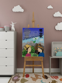 创新思维:海报以简洁,明主。主体加以产品并以蓝色为背景,衬托画面。以为人物,故事主要代表,体现了广西特色三月三节日特色。