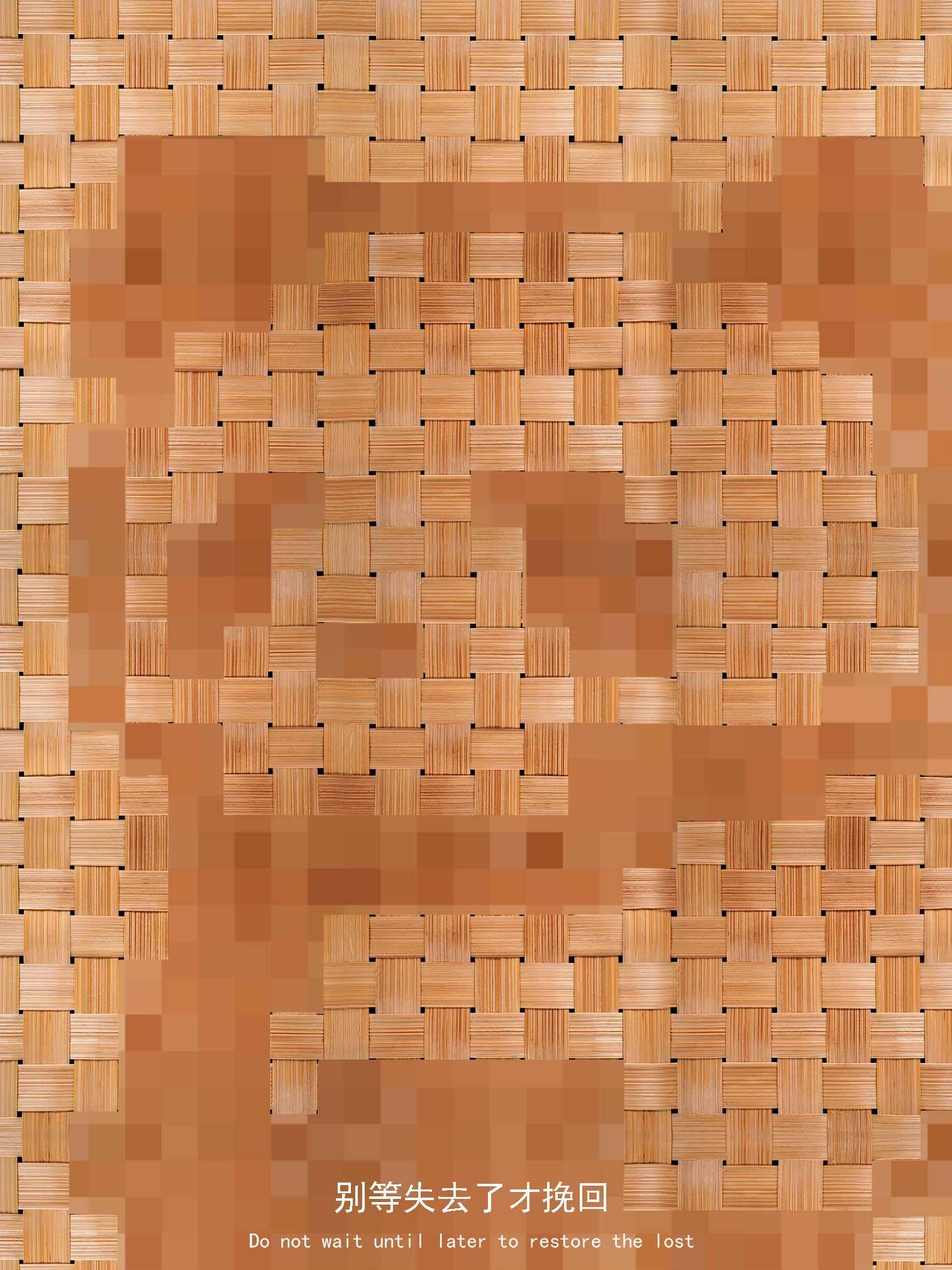 “瑞昌竹编”是我国非物质文化遗产之一,目前正面临着巨大的危机,保护和传承刻不容缓。而竹编的原材料是竹子,竹子与大熊猫息息相关,大熊猫是国家重点野生保护动物,曾经面临着绝迹的风险。画面中“大熊猫”马赛克化,呈现一种逐渐模糊、被隐去、被遗忘的感觉,隐喻瑞昌竹编技艺面临消逝的现状。别让非遗文化像大熊猫等野生动物一样即将失去了才想着如何挽回,呼吁人们应当像保护野生动物一样,关注非遗文化保护,助力非遗文化传承和发展。