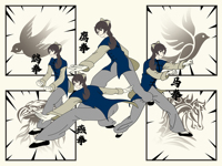 设计灵感来源于形意十二形拳中每一套拳法打法中的一个代表性的动作,根据这个动作设计出符合这个拳法的整体形象。