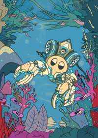 第二幅运用了蓝绿的色调组合,以展现科技与海洋的和谐交融。深邃的蓝色象征着海洋的广阔神秘,也代表着科技探索的无限可能。清新的绿色寓意着生命的活力与海洋环境的健康,两者交织,希望传达出人类利用科技探索海洋,实现可持续发展的愿景。设计的核心元素是一只机械蟹的,它代表了科技与海洋的结合,也是海水净化的象征。在设计的设定中,机械蟹的身体由先进的材料制成,配备了净化设备,能吸收转化海洋中的污染物,为海洋生物提供一个更加清洁的生存环境。