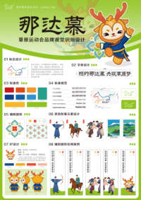 那达慕,作为蒙古族传统的体育盛会,不仅承载着深厚的文化底蕴,也是展现民族精神风貌的重要平台。为了更好地传播那达慕的精神内涵,并促进其在现代社会中的发展,本次VI设计旨在通过现代设计理念结合传统元素,创造出既符合时代审美又能深刻反映蒙古族特色的赛事品牌形象。色调选取草原绿、太阳黄为主色系,分别代表着大自然之美、阳光灿烂的日子。辅助图形采取辅助图形纹样提取自蒙古传统纹样中的盘肠纹和内蒙古白治区的省花马兰花、在蒙古族文化中,盘肠纹表示佛法回环贯彻,求无障碍。而马兰花是古样关好的象征它象征着勤劳善良,代表着蒙古族人民对美好生活的向往。字体选用简洁大方且具有一定个性化的字体作为主要文字风格,保证阅读清晰度的同时传达出现代感。其他形象元素都来源于那达慕的各项活动,如博克、赛马、射箭等,都充满了力量和动感。运动员们矫健的身姿和敏捷的动作,展现出蒙古族人民的勇敢和坚韧。这些运动是那达慕视觉的关键,是主视觉的元素之一。
