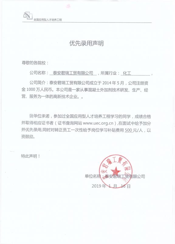泰安君瑞工贸有限公司成立于2014年5月,公司注册资金1000万人民币。本公司是一家从事混凝土外加剂技术研发、生产、经营、服务为一体的高新技术企业。